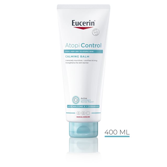 Eucerin AtopiControl Calming Balm is a daily-use body balm that has been specially formulated to soothe and intensely moisturize irritated and itchy skin. The light but nourishing oil-in-water balm is enriched with soothing Licochalcone A, Ceramides and Shea butter to strengthen skin’s barrier and relieve dryness and itching. It should also be used during a flare-up alongside Eucerin AtopiControl Acute Care Cream, Eucerin Anti-Itch Spray and your usual medication. The atopic eczema balm provides instant moisture to make skin soft and smooth and, with regular application, skin condition noticeably improves.
