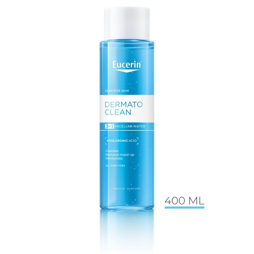 Eucerin® DermatoClean Micellar Water 3 in 1 is a mild & effective facial cleanser that thoroughly yet gently cleanses and removes impurities and make-up from face and eyes. The formula with Hyaluronic Acid and other moisturizing ingredients does not dry out the skin. Free of fragrance.