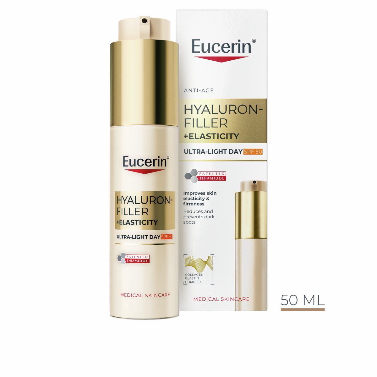 Anti-aging day fluid for skin that shows premature signs of aging. Eucerin Hyaluron-Filler + Elasticity Ultra-light Day SPF 50 is an anti-aging day fluid that improves skin’s elasticity and corrects all types of dark spots*. The unique formula delivers multiple anti-aging benefits. The Collagen-Elastin Complex, a powerful combination of Hyaluronic Acid and Creatine, re-energizes collagen production and increases skin’s elasticity. Eucerin’s patented Thiamidol reduces the appearance of dark spots and their reapparition. For skin that is smoother, more radiant, and visibly younger looking. The ultra-light day fluid also contains an imperceptible SPF 50 and a UVA filter to effectively prevent UV-induced premature skin aging and deepening of wrinkles.
