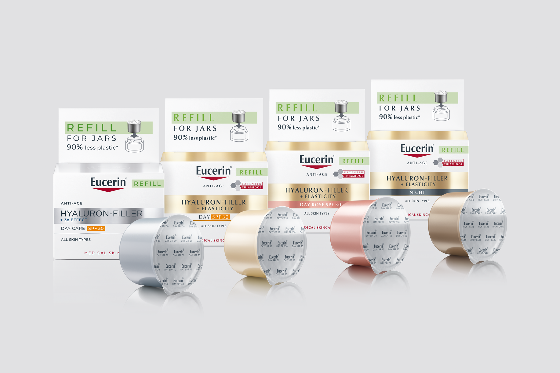 Our new Hyaluron-Filler refills for our Hyaluron-Filler jars use 90% less plastic compared to the conventional Hyaluron-Filler jars and thereby reduce packaging related CO2e emissions by 85% .